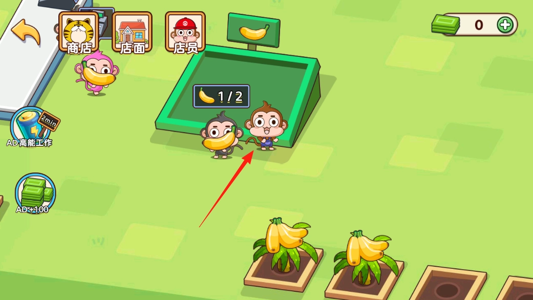 香蕉成熟后拖到标着1/2的售卖台上,每卖出一串都能赚取金币;要是缺钱了,点左下角的AD+100能临时救急,但最划算的办法还是让猴子们好好工作,这样来钱更稳当。