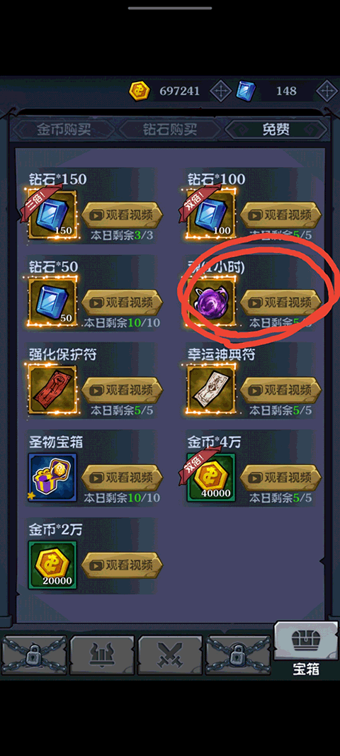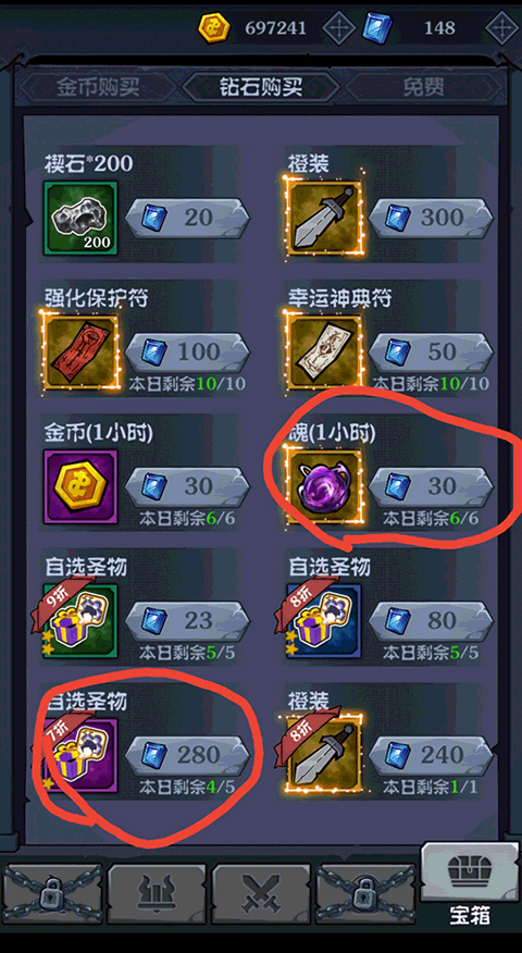 要是平时不常看广告,优先考虑入手圣物和魂会比较合适;到了后期需要升级装备时,可以买些强化保护符和幸运符,不过前期还是以入手圣物为主。