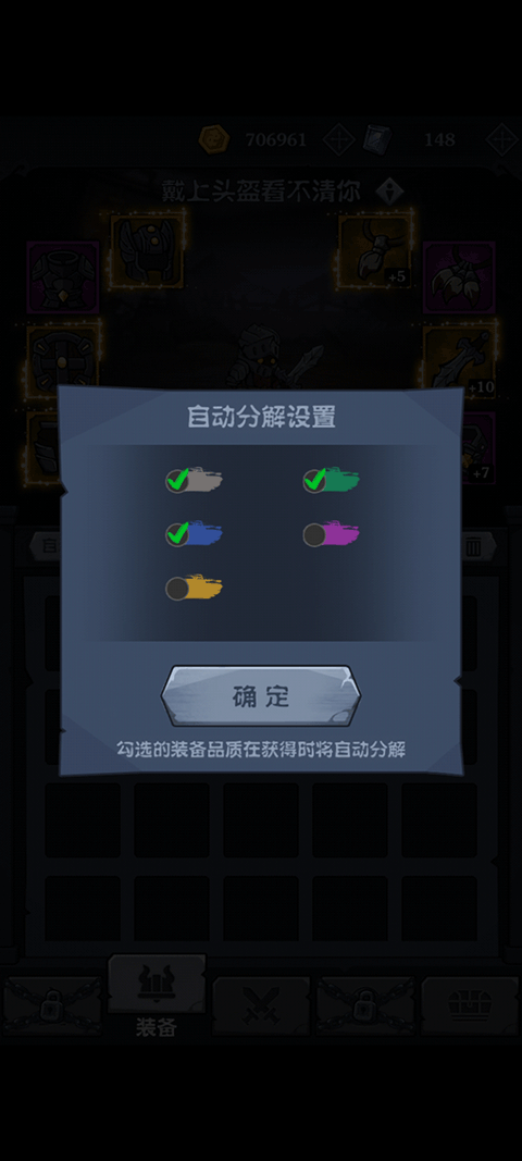 因为背包容量有限,建议开启“自动分解”功能,勾选前三种颜色的装备,这样低级装备就会自动分解,背包就不容易满了。