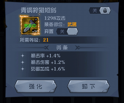 关于装备选择,直接查看装备背包里带绿色↑箭头的装备就行,前期完全可以直接换。虽然装备属性不少,而且是随机生成的,但前期只要盯着绿箭头无脑更换就没问题。