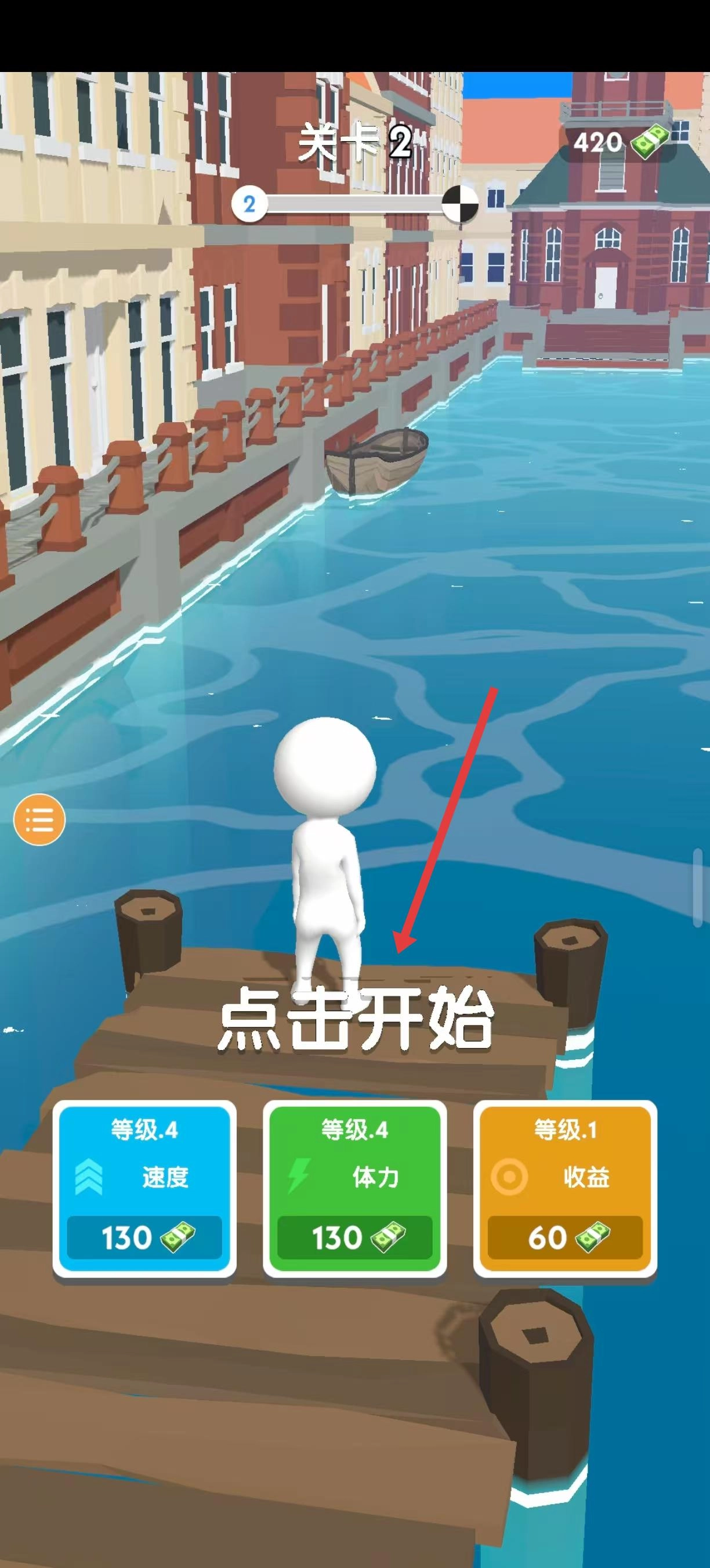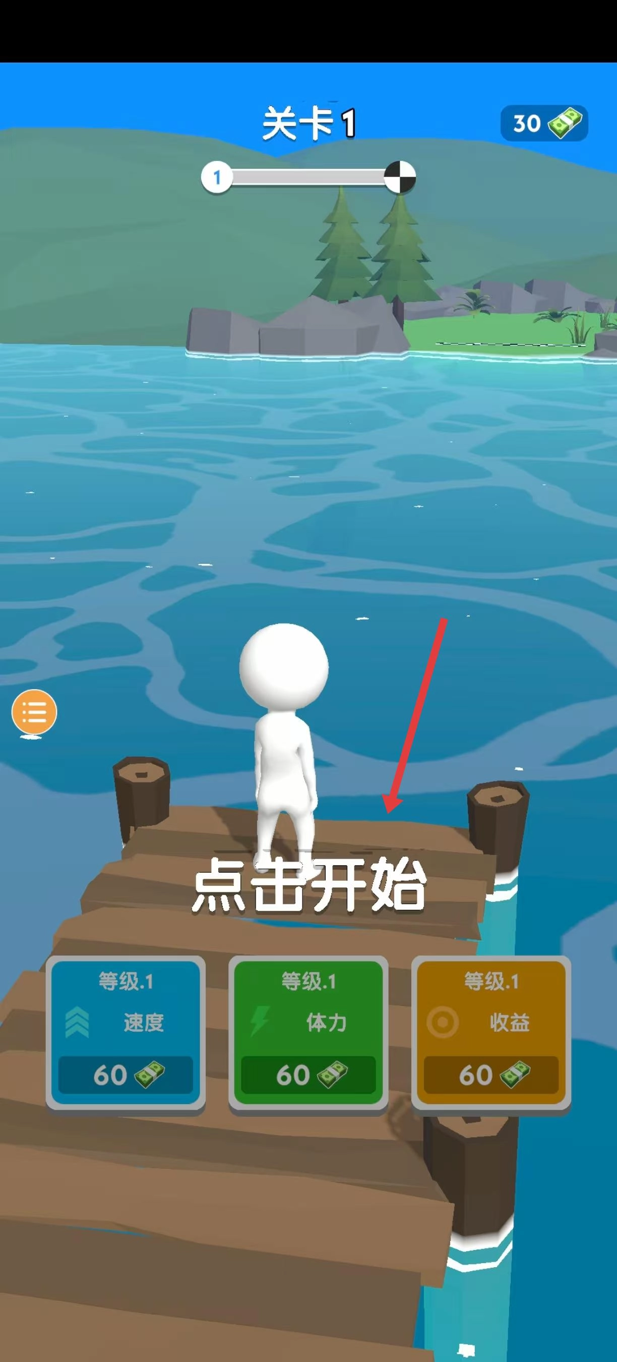 进入第一关,小人站在码头边,点击“开始”按钮后,可消耗金币来提升速度、体力、收益等属性,随后开启水上奔跑挑战,朝着对岸的方向前进。