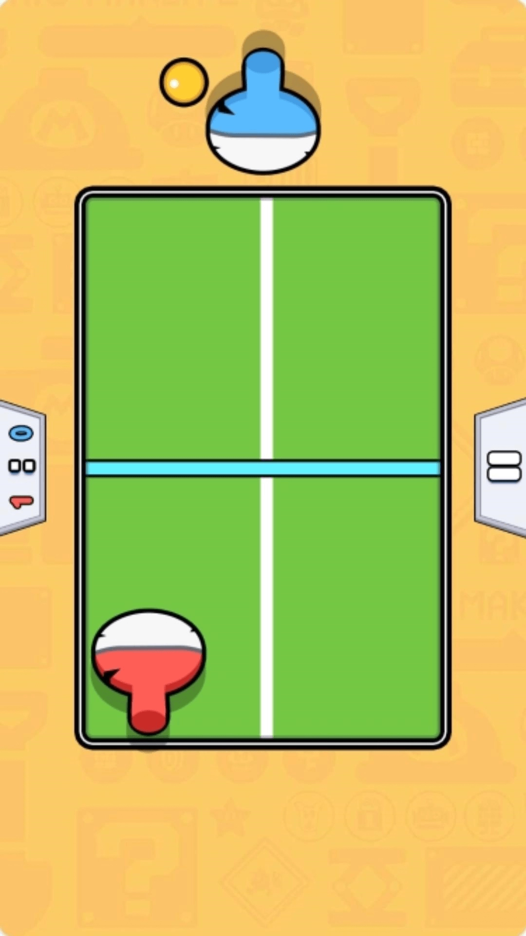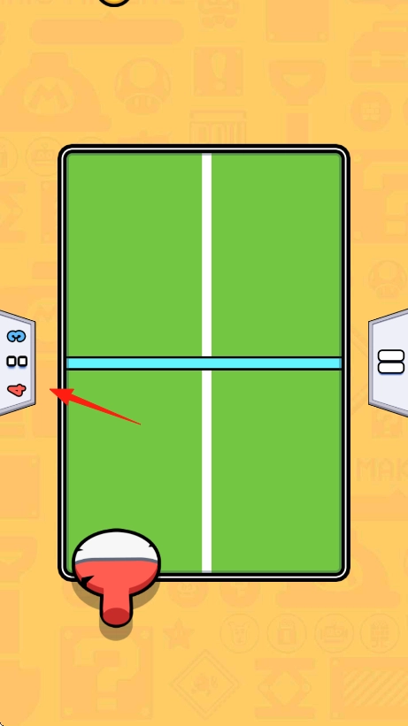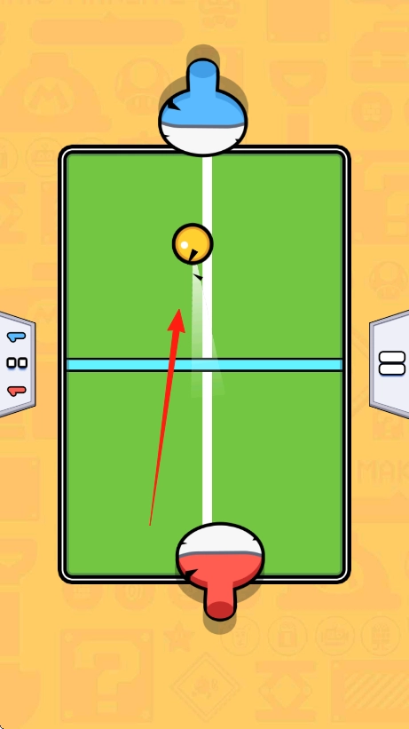 操控红蓝球拍的左右两侧,通过点击与滑动操作,击打黄色乒乓球,使其落在对方半场,借助箭头指引来预判球的运动轨迹。