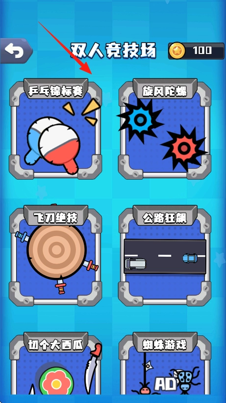 进入游戏后会直接显示主界面,上面有多种模式可供自主挑选,在双人竞技场界面中选择乒乓锦标赛,即可进入乒乓球对战界面。