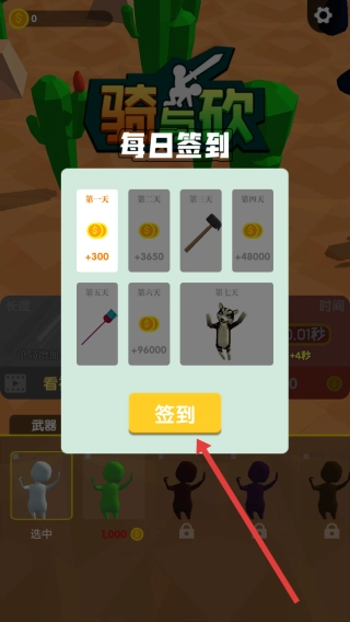 打开游戏后,当出现“每日签到”的弹窗时,点击弹窗里的【签到】按钮,就能获取金币、武器之类的奖励,以此来积攒游戏资源。