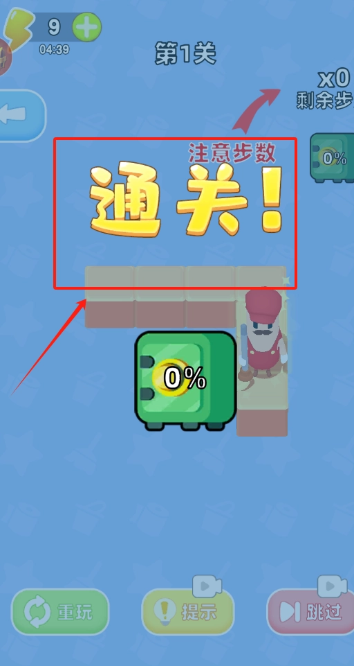 成功通关后,你可以点击重玩按钮再挑战一次,也能选择提示功能获取过关技巧,还能通过跳过选项快速进入下一关。
