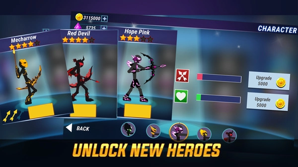 在游戏里解锁各式各样的火柴人英雄与武器,持续提高自身的技能等级;