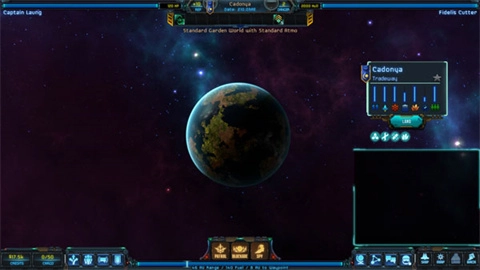 飞船的员工列表、飞船的具体资料(点击飞船名字可以改名)、地图(就是那个MAP,主要是将视角切换至当前星系。滚轮控制视野大小,左键移动视野,右键控制飞船前进)、视角切换(在轨道时显示LAND,降落在行星上显示ORBIT,即为将视野切换回至轨道上)、菜单可供玩家修改音量和窗口大小及存档(关于存档,游戏采取每步自动覆盖式存档,如果要读取确实的存档需要在读档时点击Save slots并选取该存档进行Restore
