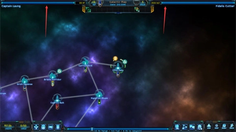 左上和右上的两条蓝条分别代表船长的血量和飞船的血量(以HP和Hull值表示)。往中间区域查看,可以了解当前星系的所属派系以及该派系对玩家的好感度。当鼠标移近时,还能看到玩家在该派系担任的角色等级,具体包括军事等级(影响派系船只对玩家飞船的应对方式)、贸易等级(影响玩家在该派系的买卖许可及货物数量限制)和法令等级(影响玩家通过合约联系人可获取的任务类型)。