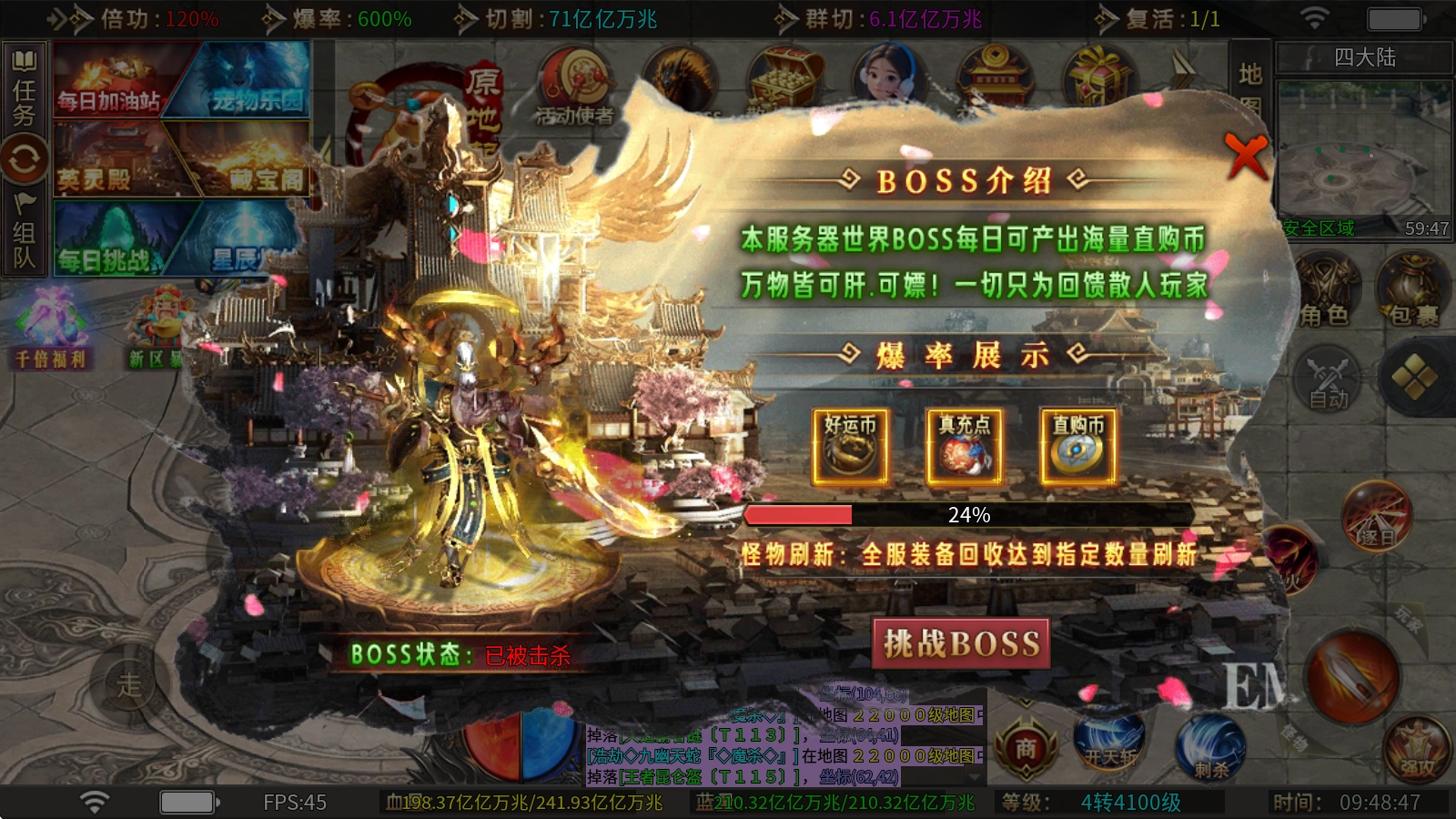 全服装备回收达到指定数量时,会刷新一只世界BOSS,击败它有机会获得好运币、真充点和直购币!