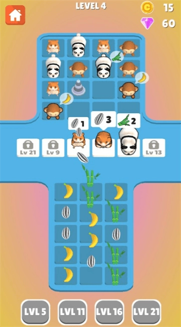 连锁消除技巧:部分关卡设有食物共享机制,单个高级食材可同时满足相邻三只动物的需求,通过合理规划投喂路线,能够触发消除特效,从而节省步骤数。