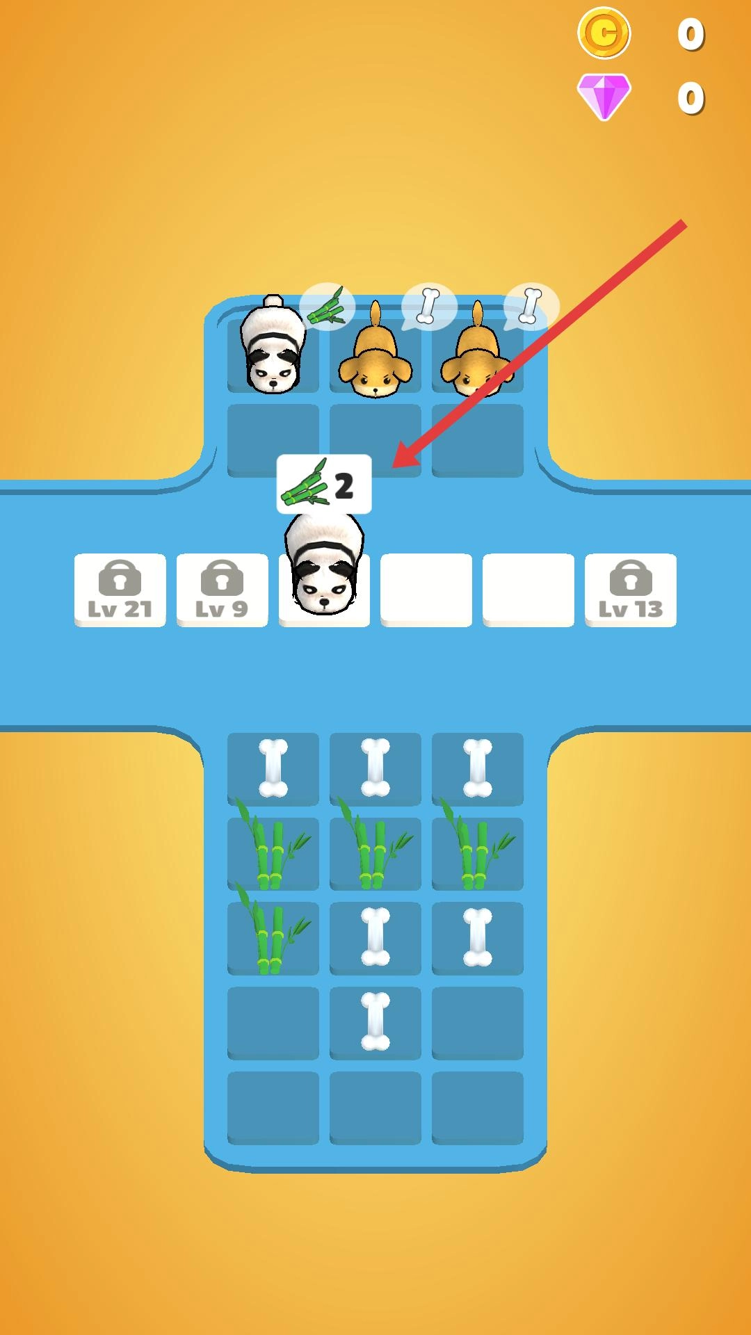 拖动带有竹子的熊猫至指定空位,依照箭头指示进行放置,留意物品数量,合理调配资源,满足动物需求以解锁新位置。