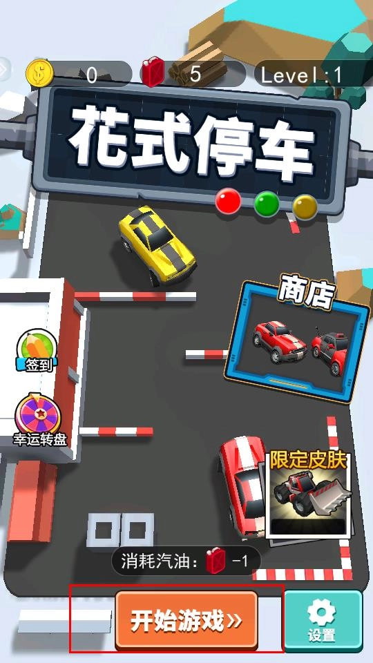 点击“开始游戏”按钮,消耗汽油开启停车挑战并投身趣味关卡,这是进入游戏的必要操作。