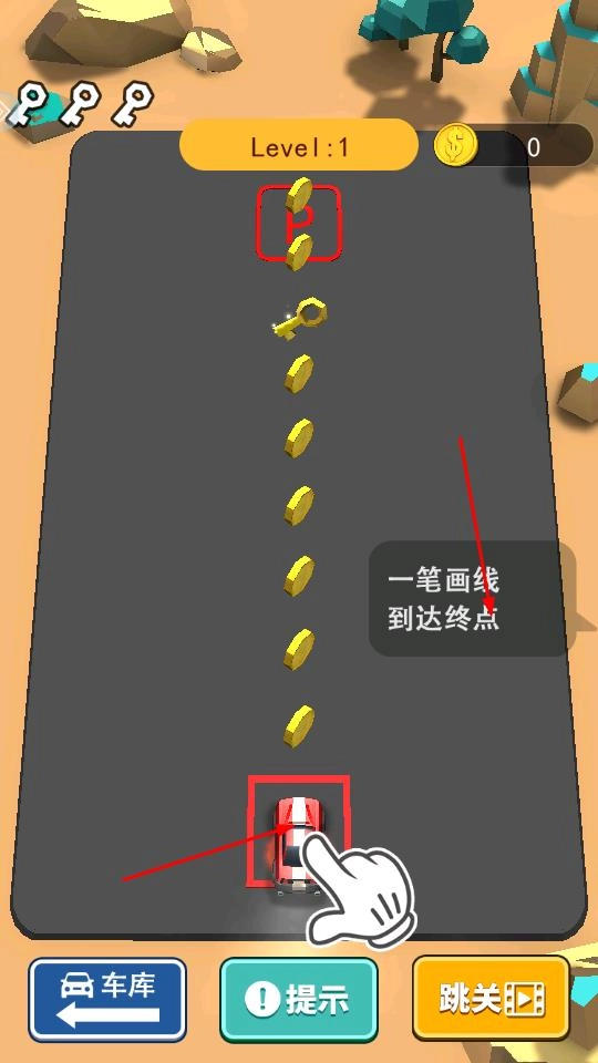 按照一笔画到终点的提示,从汽车所在位置画线连接到P停车点,途中收集金币和钥匙,完成这一核心操作。