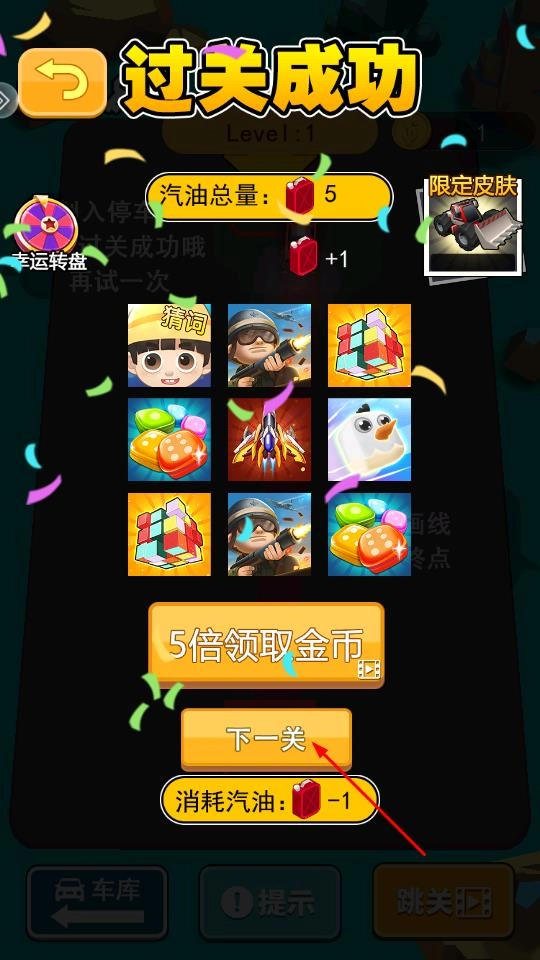 通关之后,你可以选择以5倍的数量领取金币,也能直接点击进入下一关,只要持续消耗汽油,就能推动游戏继续进行。