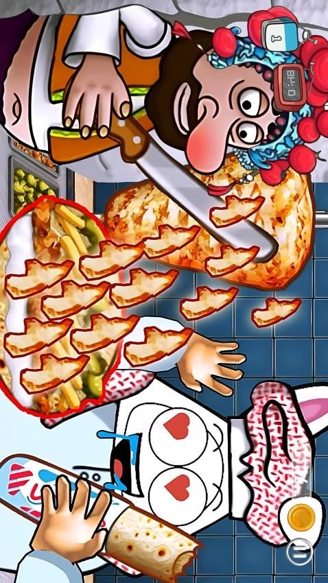 游戏的核心玩法是制作并售卖沙威玛卷饼。玩家能够用金币升级机器设备,从而提升制作效率。游戏里烤架上的肉,需要玩家亲自操控刀片来切割。
