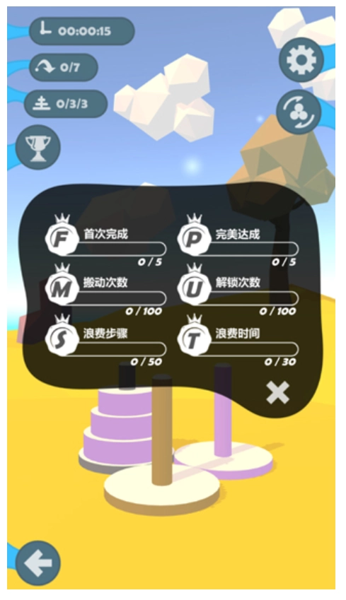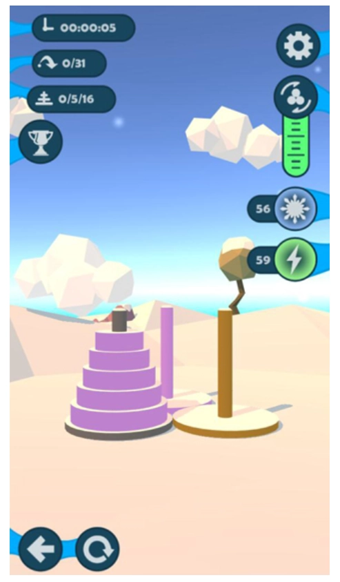 1、玩法就是大家熟悉的汉诺塔游戏,这个游戏源自印度一个古老传说中的益智玩具。游戏里,玩家要在一根柱子上从下到上按大小顺序摞起64片黄金圆盘,看似简单的游戏,玩起来却相当烧脑又刺激。