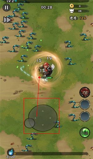 玩家进入关卡后,可借助轮盘操控角色移动;当移动中的角色靠近敌人时,英雄便会自动发起攻击。