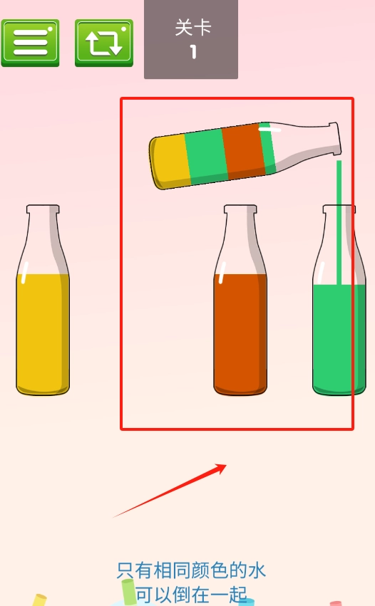 将左侧的黄色液体倒入右侧的绿色瓶子中,需要注意的是,只有相同颜色的液体才可以混合。