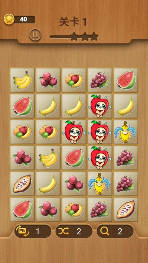 认真观察棋盘的布局,用划线的方式把两个相同的水果图案连接起来,只要配对成功就能完成消除。