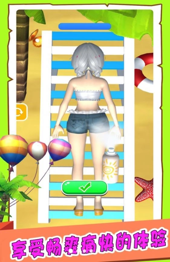 换装完成后,点击绿色对勾按钮确认当前装扮,即可完成这次沙滩时尚挑战,之后还能继续解锁新的道具。
