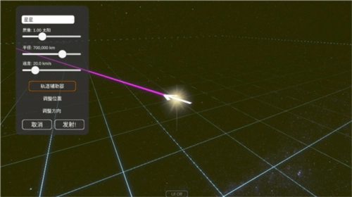 位置方向确定后,就可以调整球体的大小、自转速度和质量等参数,设置完成后点击发射就行。