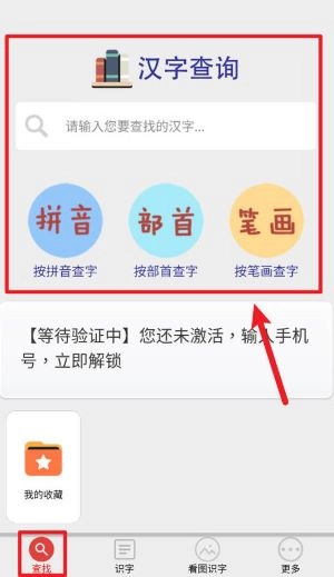进入首页后,点击“查找”栏,你可以输入汉字进行查询,也能选择拼音、部首或笔画来查找。