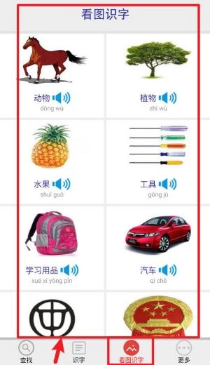 在“看图识字”页面中,孩子可通过观察图片、点击喇叭图标来学习汉字读音,借助图像联想加深对汉字的记忆。