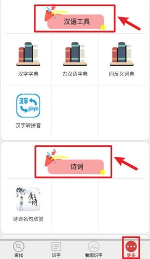 点击“更多”页面即可进入工具模块,该模块包含汉字字典、古文词典以及词义查询功能。