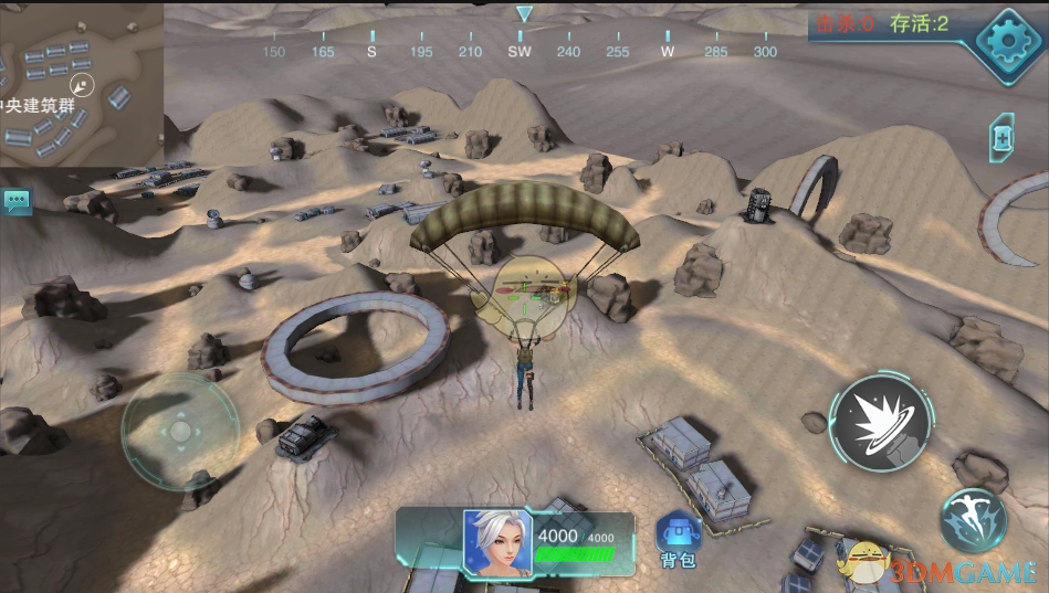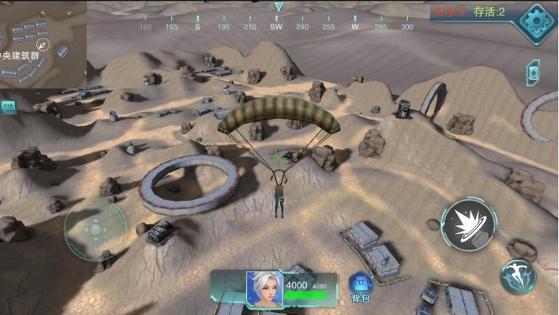 三、跳伞降落阶段 确定降落区域后,跳伞时人物会出现在所选区域的上空并缓慢下落。降落过程中,转动左侧虚拟摇杆即可操控人物前后左右移动,以此调整最终的降落点。
