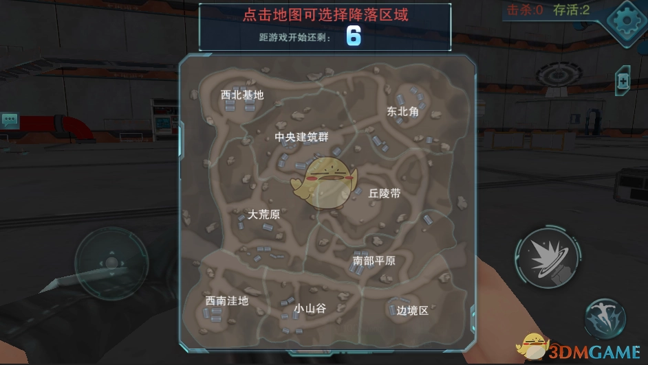 过了一会儿,等其他玩家都准备就绪了,游戏就正式开始了。这时候系统会弹出小地图,我们只要选中地图上对应的区域,就能操控自己的角色跳伞降落到那个区域里。