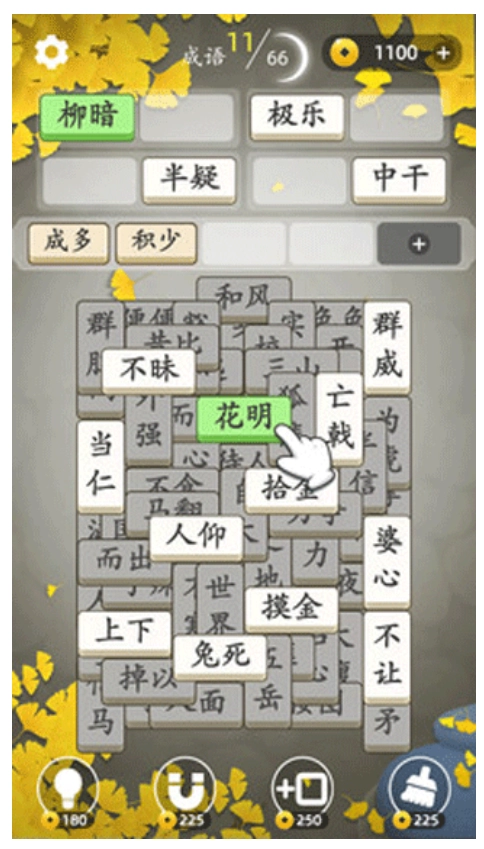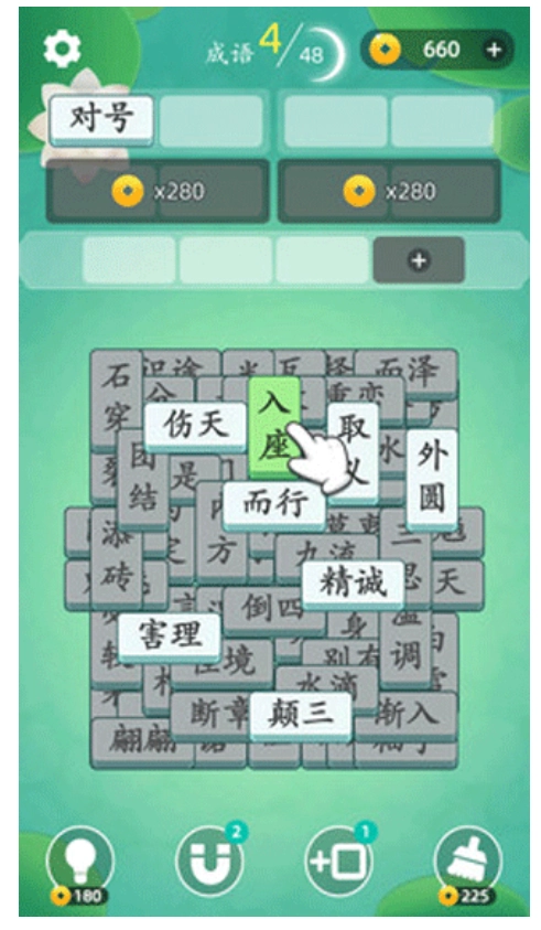 4、常用成语的每个汉字分散在不同的位置,我们只需要将这些成语按顺序找出来即可消除,当所有成语全部找出来后即可过关,游戏也会需要玩家具备一定的观察力,消除成语。