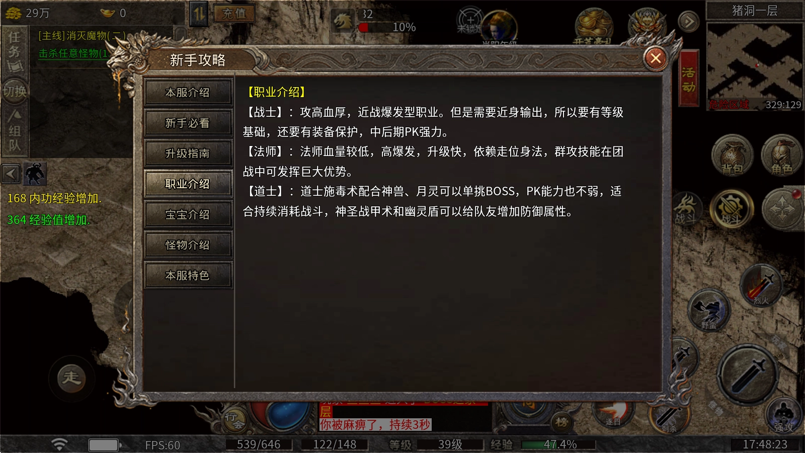 【战士】:这个职业攻击高、生命值厚实,属于近战爆发类型。不过由于得贴近敌人才能输出伤害,所以既需要一定的等级作为基础,也得有装备提供保护,到了中后期在PK方面会非常强势。