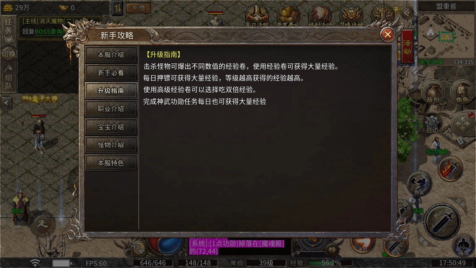 关于内功的玩法说明如下:内功等级的提升途径有两种,一是通过打怪获取经验,二是完成神武任务可得到大量内功经验;并且内功等级越高,内力减伤的比例也会相应提高。
