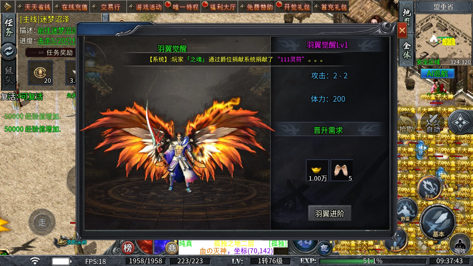 羽翼觉醒:消耗羽翼魂魄与元宝便能完成晋升,每提升一级都会增加攻击属性和体力值。