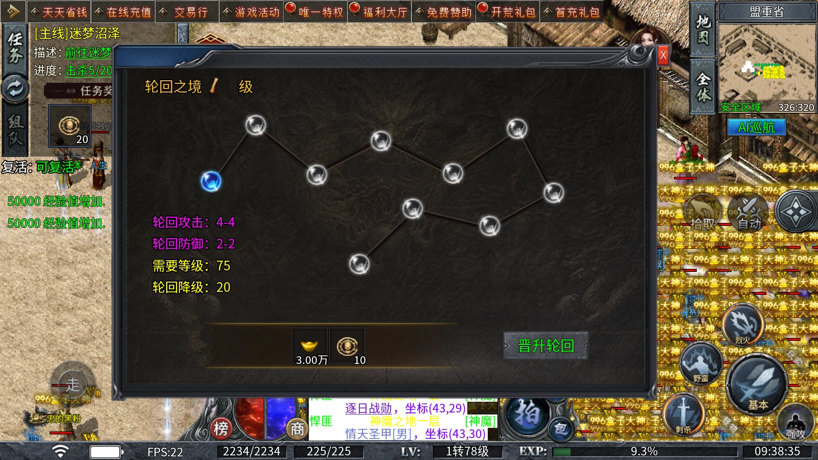 轮回之境:消耗轮回之晶与元宝进行提升,每提升一级轮回等级,角色等级会降低20级,同时可获得轮回攻击与防御属性加成。