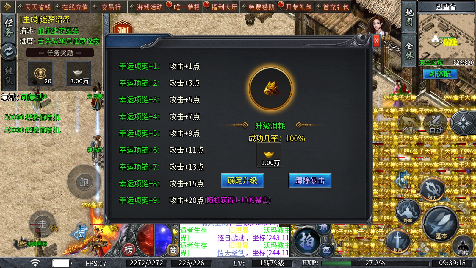 幸运项链:花费元宝就能提升等级,等级越高,升级成功率就越低,而且+9之后有机会随机得到1-10的暴击属性。