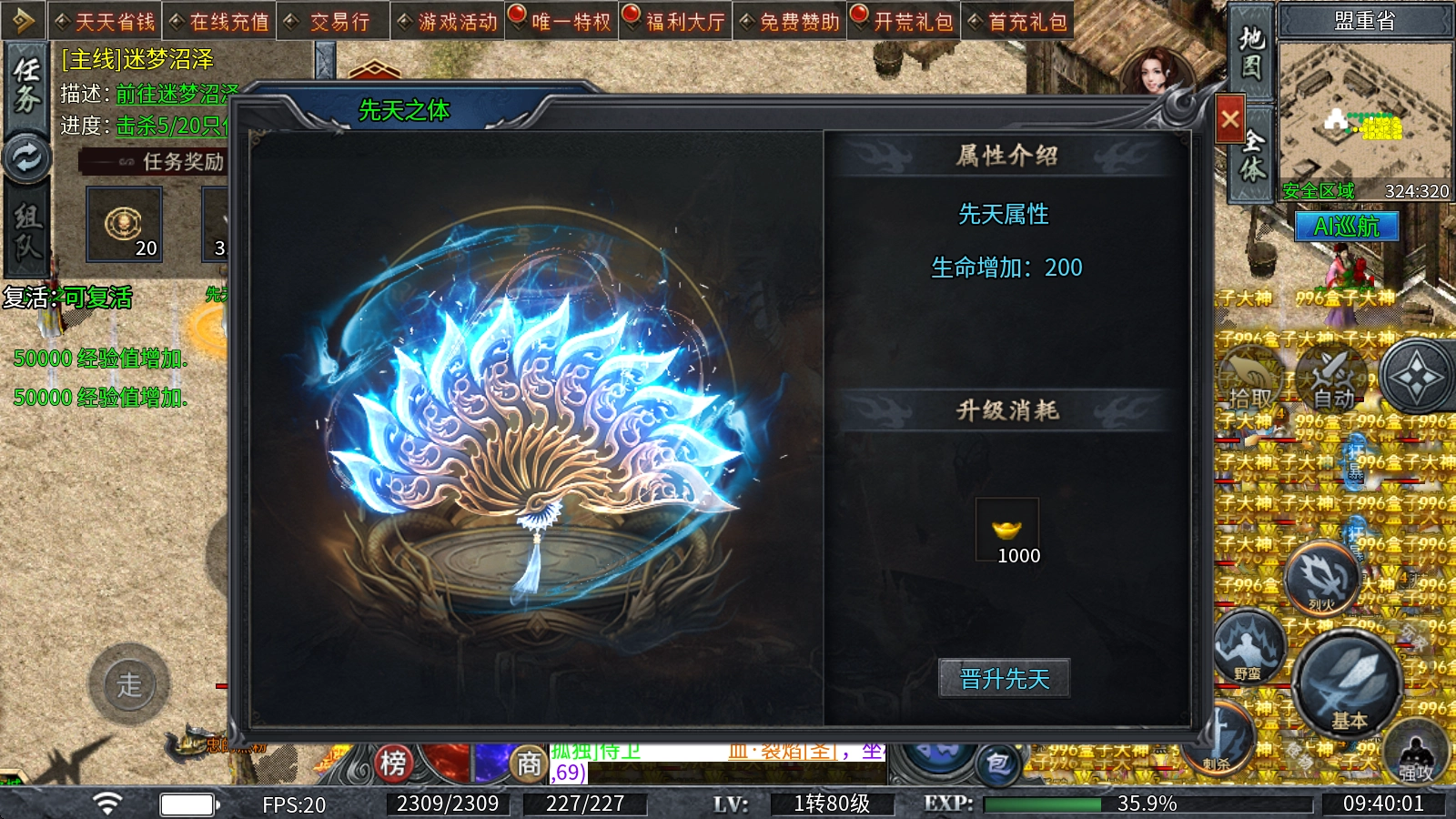 先天之体:消耗元宝即可提升,每升一级都能增加大量体力。