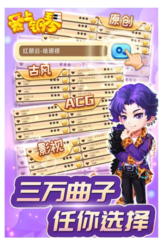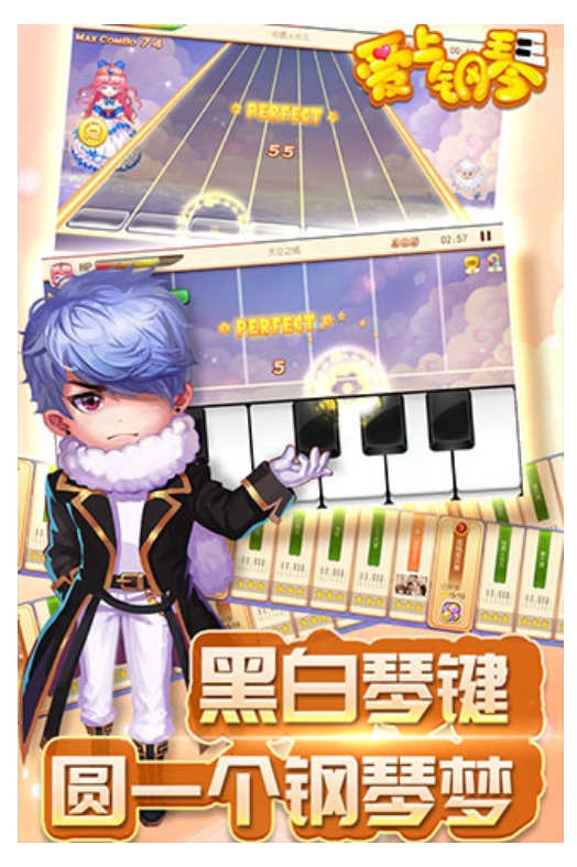 2、丰富的网络游戏,单一的弹钢琴曲谱是很容易腻的,但是游戏在钢琴模拟的基础上加入了许多时下流行的元素,比如闯关模式、Q版人物、琴师等级,乃至原创曲目,丰富的内容,提升了游戏的可玩性。