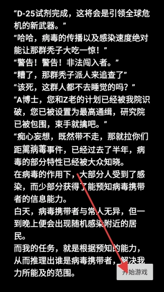 先阅读开场剧情,了解当前的病毒危机情况以及角色需要完成的任务——推理出谁是病毒携带者,之后点击“开始游戏”按钮,即可进入注册或登录的流程。