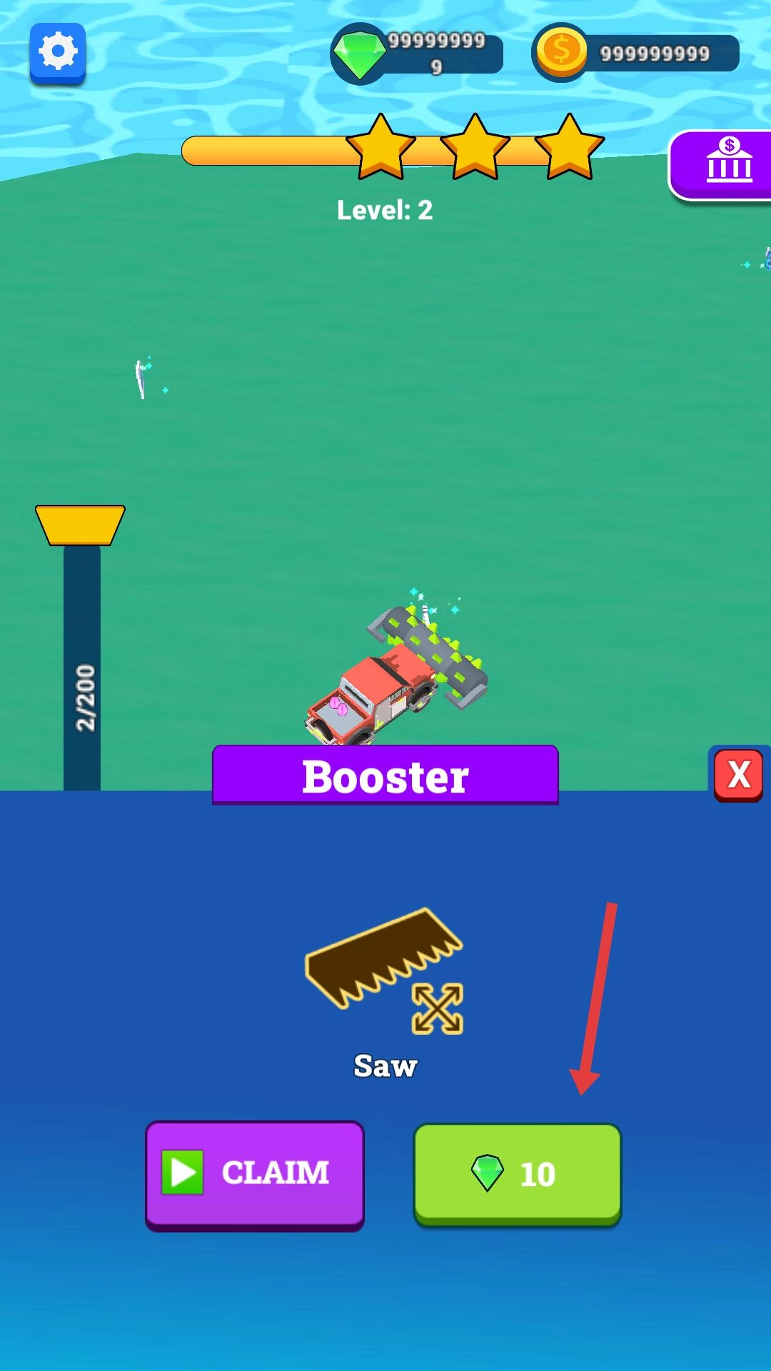 玩家在探索场景的过程中,靠近发光物体后,可以消耗10颗钻石来选择Booster以强化车辆,之后通过点击CLAIM按钮或者再次消耗钻石,就能提升车辆的能力。