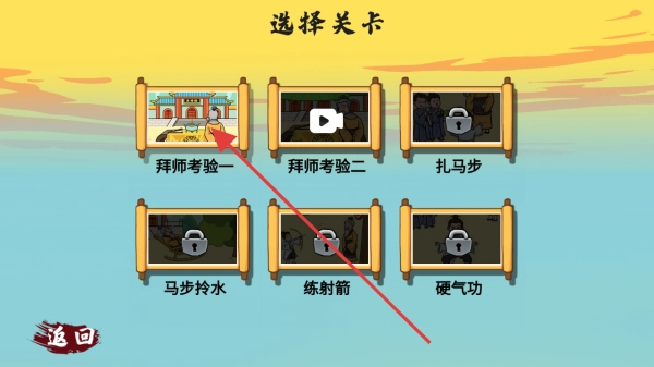 后续关卡(像扎马步、练射箭这类),按照提示来操作,借助“提示”功能解开谜题,通过相应考验,就能提升角色能力,解锁更多玩法。