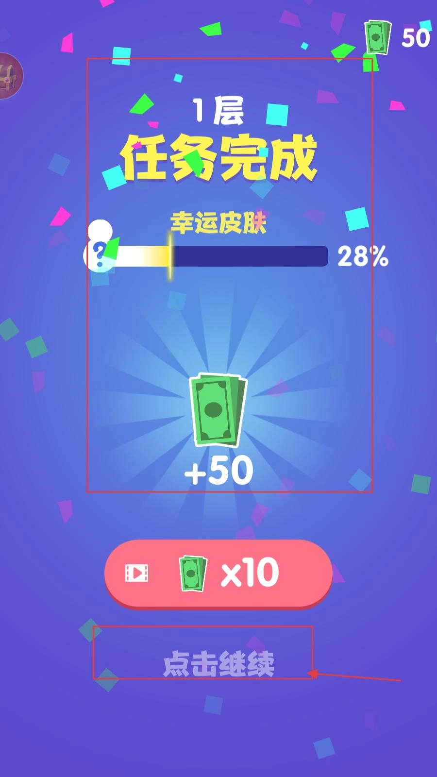 完成1层任务后,点击【点击继续】按钮可领取50金币,同时积累幸运皮肤进度,解锁全新外观,进而挑战更高层数关卡。
