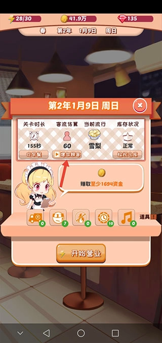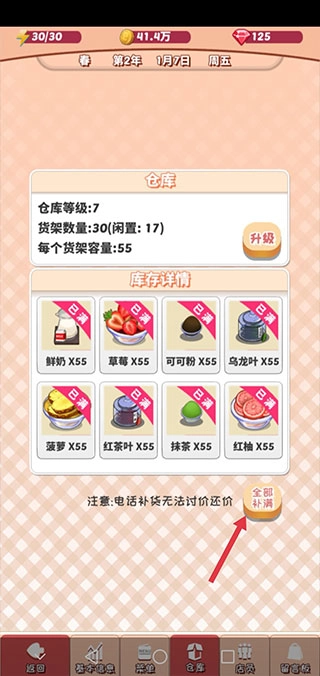 如果手速快的小可爱觉得顾客少,可以按一下,这样能额外增加5个顾客。另外要记得,每次营业前一定要确保仓库库存充足哦。