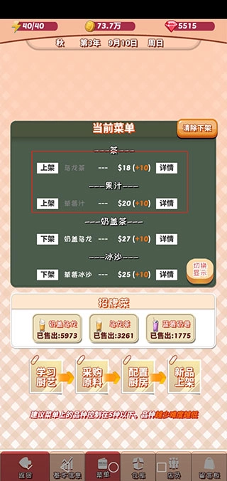 比如学了冰柠乌龙这道饮品,就得先去商店采购乌龙茶叶和柠檬,还得把制冰机打开才行哦。等你把这些原料都上架之后,界面上也会显示出你目前的菜单内容的。