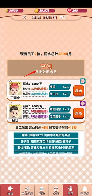 招聘员工后,需点击“店员”选项,将其分配至所需店铺,方可触发技能。