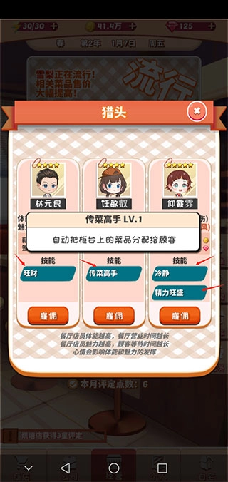 另外,茶饮店和烘焙店员工的技能存在差异,只有个别员工的技能是两店通用的。因此,在自行招聘员工时,需要查看技能栏,点击即可了解技能的具体作用。