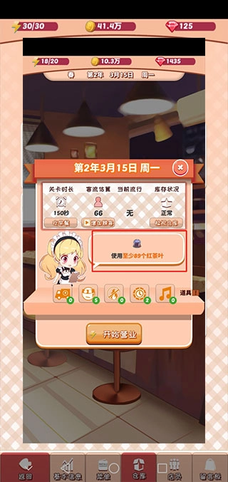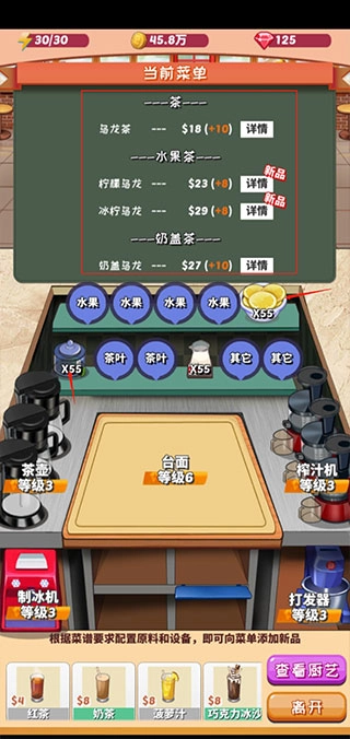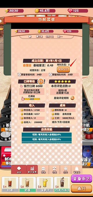 有时候遇到需要使用特定数量红茶、乌龙茶这类原料的营业任务,要是觉得有点难完成又不想看广告,其实可以去厨房把原料换出来,再换回自己原本的菜单,这样任务就会刷新了——毕竟这类任务是随机生成的嘛。