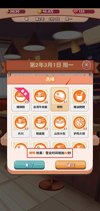 选择食物后会有显示营业时间增加多少秒的