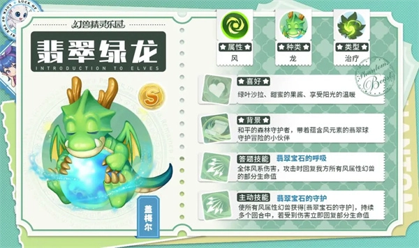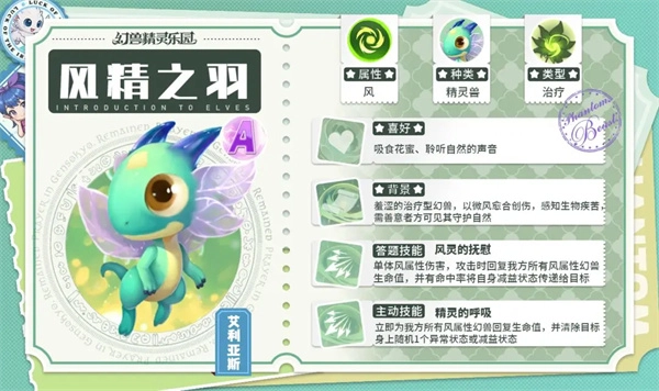 主动技能效果:能够瞬间为我方队伍里所有的风属性幻兽恢复生命值,同时还会移除目标身上随机的1个负面状态。