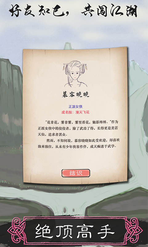 侠客!江湖路险,为何仍要涉足?是为虚名?为薄利?还是为了那份惩恶扬善的初心?今天要给大家介绍的是——《所谓侠客》,这是一款由个人独立开发、以江湖为背景的纯单机RPG游戏。游戏设置了首页、装备、江湖、闯关、武功、伙伴等多个模块,大大提升了游戏的可玩性。玩家将在游戏中化身侠客,自由书写属于自己的武侠篇章,超多精致的游戏场景与古色古香的画面,能让你沉浸式感受江湖的独特魅力,还有种种江湖柔情与热血战斗等你来体验。更值得一提的是,你可以根据自己的喜好选择门派,赤刀门、拜月神教、丐帮、华山等任你挑选,快来游戏世界里快意恩仇,领略这份精彩吧!